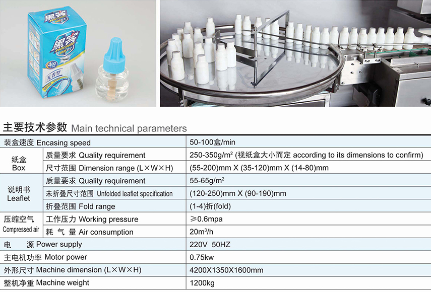 本產(chǎn)品是我公司結(jié)合國外裝盒機的先進技術(shù)及根據(jù)國內(nèi)制藥行業(yè)的實際情況而研發(fā)的擁有新型、具有先進的瓶裝盒生產(chǎn)聯(lián)動線,能適用于圓形瓶和異形瓶以及相類似物品的裝盒包裝,具有自動完成使用說明書的折疊、紙盒自動打開、物品裝盒、打印批號、封盒等功能。該機可以單獨使用亦可以與其他設備聯(lián)動使用,形成成套生產(chǎn)聯(lián)動線。